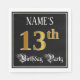 This fancy and luxurious birthday paper napkin design features an editable name and the message “13th Birthday Party”. The large number “13th” has an imitation/faux gold-inspired colouring pattern, and the words “Birthday Party” are in elegant script-style text. The background is coloured black by default (although it can be customized). Ornate, elegant paper napkins like this might be useful at a birthday party being held in celebration of somebody’s 13th birthday. [~Z0000565]