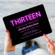 Cool modern 13th birthday party invitation with "thirteen" in hot pink glowing neon lights against a black background.