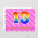 L'avant de cette carte postale à l'occasion d'un anniversaire, au thème affectueux, joyeux et gai, présente un grand nombre "13" avec un motif inspiré d'un dégradé de spectre d'arc-en-ciel. Elle comporte également le message "Joyeux 13ème Anniversaire," et un nom de destinataire modifiable. L'avant présente en outre un motif rayé rose foncé et rose clair joyeux contenant des formes de cœur. Le verso comporte un message de vœux d'anniversaire personnalisé, ou pourrait éventuellement être effacé et laissé vide si un message doit être écrit à la main à la place. Une carte postale d'anniversaire personnalisée comme celle-ci pourrait être un moyen amusant de célébrer le treizième anniversaire de quelqu'un. Des cartes postales comme celle-ci pourraient également être utilisées pour inviter des invités à une fête d'anniversaire