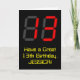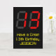 The front of this geeky and fun birthday themed greeting card design features a large number "13" having a red seven segment digital display inspired appearance, along with the message "Have a Great 13th Birthday," and a customizable name, on a black coloured background. The inside features a customized birthday greeting message, or could perhaps be cleared and left blank if a message is to be written by hand instead. A customizable birthday card like this might be a fun way to acknowledge somebody’s thirteenth birthday. [~Z0000386]