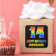 This fun, cheerful, and colourful birthday-themed sticker design features a large number "14" and the message "HAPPY BIRTHDAY,", both having a rainbow spectrum gradient inspired pattern colouring, along with a bold yellow customizable name. The background is coloured black. Fun stickers this might be used when wrapping a gift or present in honour of somebody’s fourteenth birthday, or perhaps maybe be handed out to the attendees at a birthday party or celebration. [~Z0000480]