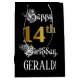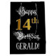 This elaborate and fancy birthday gift bag design features the message “Happy 14th Birthday,”, plus an editable recipient name. Some of the message is in an opulent script-style text. The large number “14th” features a faux/imitation gold-inspired look pattern. The background is coloured black. An elegant birthday themed gift-bag like this might be a respectable way to wrap a gift or present being given to somebody who is celebrating their fourteenth birthday. [~Z0000560]
