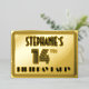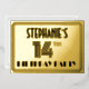 The front of this 1920s/1930s style inspired fourteenth birthday celebration foil invitation card design features an editable name, a fancy art deco look inspired number “14th”, the message “BIRTHDAY PARTY”, and a border pattern consisting of lines. The back features personalized details about the event, such as the date, time, place, and any other important information. Luxurious, elegant, customizable invitations like these might be used to invite attendees to a birthday party being held to celebrate somebody’s 14th birthday. [~Z0000594]