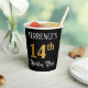 This luxurious and opulent birthday themed paper cup design features a custom name and the message “14th Birthday Party”. The large number “14th” has an imitation/faux gold-inspired colouring pattern, the words “Birthday Party” are in elegant script-style text, and the background is coloured black by default (although it can be customized). Ornate, elegant paper cups like this might be useful to have at a birthday party/celebration being held to celebrate somebody’s fourteenth birthday. [~Z0000567]
