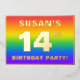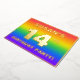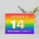 The front of this vibrant and upbeat fourteenth birthday celebration foil invitation card design features a custom name, a large number “14th”, the message “BIRTHDAY PARTY!”, and a border. The background of the front features an exciting, multicolored, rainbow spectrum inspired gradient pattern. The back features personalized details about the event, such as the date, time, venue/location, and any other useful information. Personalized invitations like these might be a fun way to invite guests to a birthday party being held in celebration of somebody’s 14th birthday. [~Z0000599]