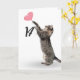 Grey tabby cat with pink heart balloon for 14th birthday on white background.