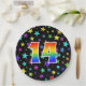 This cheerful, fun, and colourful paper plate design features a large number "14" coloured with a rainbow spectrum gradient inspired pattern. The background features a pattern of colourful star shapes. Fun paper plates like this might be used at a celebration being held to observe somebody’s fourteenth birthday, or a couple’s 14th anniversary, or some other 14th event. [~Z0000493]