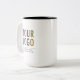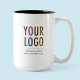 Personalize our 15 oz ceramic mug with your business logo and custom text. The larger 15 ounce size is convenient for employees because they don't need to refill it as often as the standard size mug. Custom logo mugs make a long lasting impression as swag and office gifts. Available in 15 oz (15 ounce) in classic white, two-tone (with inside colour), combo (with inside colour and handle colour), and as a morphing mug. No minimum order quantity and no setup fee.