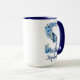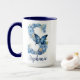 Un mug café personnalisé dans des tons de bleu avec un papillon coordonné, présentant le monogramme de la lettre "A". Personnalisez-le facilement avec votre nom ou créez un cadeau unique pour vos proches. Suffisamment d'espace pour ajouter une citation ou un message supplémentaire ou même un arrière-plan. Ce mug est également disponible dans différents styles et combinaisons de couleurs. Parcourez la collection pour voir des exemples de ce type de police sur les différents styles et tailles de tasses.