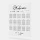 A simple but elegant transparent wedding seating chart with 15 tables on 3 rows. The title "Welcome" above and the names of the bride and groom below are written in an elegant calligraphy, the rest in caps. All text is black.
