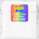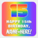 This fun and cheerful birthday square sticker design features a large number “15” with a colorful rainbow spectrum inspired gradient pattern, along with the message “HAPPY 15th BIRTHDAY,”, and an editable recipient name. The background also features a vibrant multicolored rainbow spectrum inspired gradient pattern. Joyful, fun, personalized stickers like this might be given as a birthday gift, or used while wrapping gifts/presents, or perhaps used as birthday party decorations when celebrating somebody’s fifteenth birthday. [~Z0000571]