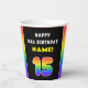 This upbeat and fun birthday themed paper cup design features the number “15“ having a vibrant multicolored rainbow spectrum inspired gradient pattern, along with the message “HAPPY 15th BIRTHDAY,”, and a personalized recipient name. Joyful paper cups like this might be used when hosting a party for somebody in celebration of their fifteenth birthday. [~Z0000639]