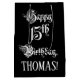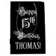 This ornate and lavish birthday-themed gift bag design features the message “Happy 15th Birthday,” in elaborate script style text, on a black coloured background. It also features a personalized recipient name. An elegant birthday themed gift bag like this might be a respectable way to wrap a gift or present being given to somebody who is celebrating their 15th birthday. [~Z0000557]