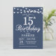 15th Birthday Invitation with String Lights. Blue Background. Kids Birthday. Boy or Girl Lady Elegant bday Invite. 13th 15th 16th 18th 20th 21st 30th 40th 50th 60th 70th 80th 90th 100th, Any age. For further customization, please click the "Customize it" button and use our design tool to modify this template.