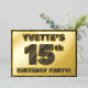The front of this bold fifteenth birthday celebration/party foil invitation card features a customizable name, a large number “15th”, the message “BIRTHDAY PARTY!”, and a border, all featuring a rustic, yet sophisticated, faux wood grain appearance inspired pattern. The back features personalized details about the event, such as the date, time, location, and any other information that may be useful. Customizable invitations like these might be used to invite guests/attendees to a birthday gathering being held to celebrate somebody’s 15th birthday. [~Z0000595]