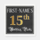 This fancy and opulent birthday-themed paper napkin design features a personalized name and the message “15th Birthday Party”. The large number “15th” has a faux/imitation gold-inspired coloring pattern, the words “Birthday Party” are in luxurious script-style text, and the background is colored black by default (although it can be customized). Ornate, elegant paper napkins like this might be useful to have at a birthday celebration being held to honor somebody’s 15th birthday. [~Z0000565]