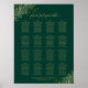 This beautiful wedding seating chart includes table assignments for 160 guests, with 10 people at each table. The design is simple yet elegant with gold text on a lush emerald green background and features lacy gold faux foil filigree in the corners with fancy script calligraphy reading "please find your table." Sophisticated and chic.