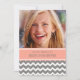 Les 16èmes invitations de fête d'anniversaire de photo faite sur commande dans le rose orange de pêche élégante et moderne, l'amusement de gris de charbon de bois et de blanc et le chevron décontracté zigzague motif de rayures. Ajoutez votre nom, photo, et détails de partie pour 16ème une invitation unique et élégante de fête d'anniversaire.