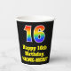 This exciting and fun birthday paper cup design features a large number “16” having a rainbow spectrum gradient inspired pattern. It also features the message “Happy 16th Birthday,”, and a personalized name. The background is coloured black. Colourful, vibrant paper cups like this might be fun to have at a birthday celebration being held to celebrate somebody’s sixteenth birthday. [~Z0000537]