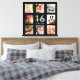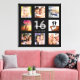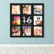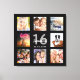 A unique 16th birthday gift or keepsake, celebrating her life with a collage of 8 of your photos. Add images of her family, friends, pets, hobbies or dream travel destination. Personalize and add a name, age 16 and a date. Grey and white coloured letters. A chic black background. This canvas is also available in our store with white or rose gold coloured background.