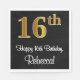 This sophisticated, stylish, and elegant birthday paper napkin design features a large ordinal number “16th” having an imitation/faux gold-like gradient pattern, plus the birthday greeting message “Happy 16th Birthday,” and a customizable name in a script-style font. It also has a black-coloured background. Paper napkins like this might be used when celebrating somebody’s sixteenth birthday. [~Z0000516]