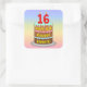 This colourful and joyful birthday-themed square sticker design features a cartoon-style depiction of a three-tier birthday cake having numeral-shaped candles on top showing the number “16“, along with the message “HAPPY 16TH BIRTHDAY,”, and a customizable recipient name. The background has a multicolored pastel rainbow spectrum inspired gradient pattern. Fun birthday themed stickers like these might be given out or used at a party for somebody who is celebrating their 16th birthday, or perhaps used when wrapping gifts/presents or preparing invitations for such an event. [~Z0000624]