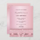 A modern, stylish and glamourous invitation for a girl's Sweet 16th birthday party. A faux blush pink metallic looking background with an elegant bow, ribbon and sparkle. The name is written with a modern dark rose gold coloured hand lettered style script. Templates for your party details.