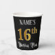 This ornate and opulent birthday paper cup design features a customizable name and the message “16th Birthday Party”. The large number “16th” has an imitation/faux gold-inspired colouring pattern, and the words “Birthday Party” are in elegant script-style text. The background is coloured black by default (although it can be customized). Luxurious, fancy paper cups like this might be used at a birthday party/celebration being held in celebration of somebody’s sixteenth birthday. [~Z0000567]
