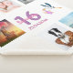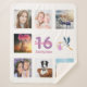 A gift for a girl's 16th birthday, celebrating her life with a collage of 8 of your photos. Templates for a name, age 16 and a date. Date of birth or the date of the anniversary. Pink and purple coloured letters. Elegant white background.