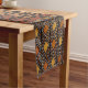 something elegant and earthy for your dining room, this table runner has tribal textiles as inspiration. ethnic textiles and black, rust, orange and yellow. 16x 90 inches and a dramatic addition to the dinner party.