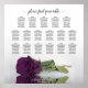 This 17 table wedding seating chart has table assignments for 170 guests (10 people per table.) The design is elegant, stylish, modern, romantic and chic, featuring a single long stemmed plum purple or eggplant coloured rose reflecting in water with waves and ripples. There is a fancy script calligraphy title reading "please find your table" as well as space for the names of the couple and the wedding date. Great way to make your reception beautiful while helping your guests find the right seat.