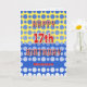Happy birthday to a 17 year old boy or girl. Add their name on the front and personalize the greeting inside. The front has the text in bright red and white, with a background of gradient blue circles on a blue and yellow block background. Inside, the background is a similar pattern of repainting circles. The customizable message is "It's time to Have celebrate fun and eat cake. This day is special And so are you! HAPPY BIRTHDAY"