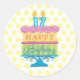 Happy Birthday colourful cake with yellow polka dot background round stickers. Customized for a 17th birthday. Seal your invitations or thank you envelopes. Use as labels for treat bags. Add to scrap book pages and photographs for accents. Use these stickers to put the finishing touches on all your birthday wishes.