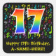This fun, colourful, and vibrant birthday themed sticker design features a large number "17" having a rainbow spectrum gradient inspired pattern. It also features the message "Happy 17th Birthday,", and a personalized name. Part of the background features a colourful music notes and symbols pattern. Fun, customized birthday stickers like this might be used as a birthday party decoration, or perhaps given as a birthday present, or perhaps be used when wrapping birthday gifts being given to celebrate a singer’s, a musician’s, a song composer’s, or somebody else’s seventeenth birthday. [~Z0000423]