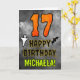 The front of this spooky and scary Halloween themed birthday greeting card design features a large number “17”, along with the message “HAPPY BIRTHDAY,”, and a customizable name. There are also depictions of a bat and a ghost on the front. The inside features a custom birthday greeting message, or could perhaps be cleared and left blank if a message is to be written by hand instead. A personalized birthday card like this might be a fun way to send a message in celebration of somebody’s seventeenth birthday that also falls on Halloween (October 31st). [~Z0000547]