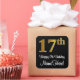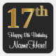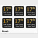 This elegant, stylish, and luxurious birthday square sticker design features a large ordinal number “17th” having a faux/imitation gold-like look, in addition to the birthday greeting message “Happy 17th Birthday,” and an editable name in a script-style font. The background is coloured black. Sophisticated birthday-themed stickers like this might be used when giving a gift or present in celebration of somebody’s seventeenth birthday, or perhaps might be given out to the guests at a birthday celebration or party. [~Z0000517]