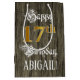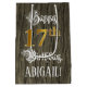 This elaborate and luxurious birthday-themed gift bag design features the message “Happy 17th Birthday,”, and a custom recipient name. Some of the message is in elegant script-style text, the large number “17th” features an imitation/faux gold-inspired look pattern, and the background has an imitation/faux woodgrain-inspired pattern. An ornate birthday themed gift bag like this might be a respectable way to wrap a gift or present being given to celebrate somebody’s 17th birthday. [~Z0000562]