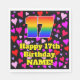 This cheerful and joyful birthday-themed paper napkin design features a large number “17” having a rainbow spectrum gradient inspired pattern. It also features the message “Happy 17th Birthday,”, and a customizable name. The background features a pattern of heart shapes with colours like purple, red, and pink. Happy, friendly paper napkins like this might be fun to use at a birthday celebration/party being held to honour somebody’s 17th birthday. [~Z0000550]