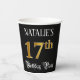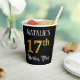 This elegant and opulent birthday paper cup design features an editable name and the message “17th Birthday Party”. The large number “17th” has an imitation/faux gold-inspired coloring pattern, and the words “Birthday Party” are in fancy script-style text. The background is colored black by default (although it can be customized). Ornate, luxurious paper cups like this might be useful to have at a birthday celebration/party being held to celebrate somebody’s 17th birthday. [~Z0000567]