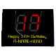 This geeky and silly birthday themed gift bag design features a large number "17" having a red seven segment digital display inspired look, along with the message "Happy 17th Birthday," and a customizable name in geeky yellow text, on a black coloured background. A customizable gift bag like this might be used when wrapping gifts or presents being given to somebody who is celebrating their seventeenth birthday. [~Z0000389]