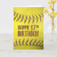 Extreme closeup of a yellow softball with reddish brown stitching for 17th birthday.