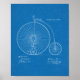 1885 Vintage high wheeler or Penny farthing bicycle US patent technical design illustration. Pedal drive with side support wheels.