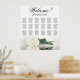Enhance the elegance, romanticism, and flair of your wedding celebration with this 18 table seating chart, which accommodates up to 180 guests, with each table having 10 seats. The design showcases a stunning, contemporary floral motif that includes a solitary, long-stemmed ivory, white, or cream coloured rose placed horizontally and reflecting in a pool of water. The heading is written in elegant script calligraphy and reads "Welcome! Please find your seat," with the names of the newlyweds and the wedding date at the bottom. This seating chart offers a superb opportunity to warmly welcome your invitees and assist them in locating their respective seats with ease.