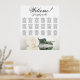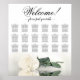 Améliorez l'élégance, le romantisme et l'atmosphère de votre fête mariage avec ce tableau de 18 places, qui peut accueillir jusqu'à 180 personnes, avec chaque table de 10 places. Le design présente un magnifique motif floral contemporain qui comprend un rose solitaire, à longue tige en ivoire, blanc ou crème placé horizontalement et réfléchissant dans un bassin d'eau. Le titre est écrit en calligraphie de script élégante et dit "Bienvenue! Veuillez trouver votre siège", avec le nom des jeunes mariés et la date du mariage en bas. Ce tableau de sièges offre une excellente occasion d'accueillir chaleureusement vos invités et de les aider à trouver facilement leurs sièges respectifs.