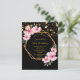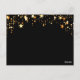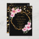 Une floraison tropicale sous les étoiles 18ème anniversaire invitation avec fleurs d'hibiscus roses, verdure et un cadre géométrique en faux or et étoiles dorées. Arrière - plan noir élégant. Modèles pour un nom écrit avec un script moderne de style manuscrit, modèles pour vos informations de fête. Texte noir. Parfait pour un été, une piscine ou une fête de plage ! Dos : couleur arrière - plan noire et étoiles dorées.