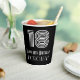 This vintage look and 1920s/1930s style inspired birthday-themed paper cup design features a large art deco inspired appearance number “18”, in addition to the birthday greeting message “Happy 18th Birthday,” and a customizable name. The background is coloured black. 1920s/1930s style inspired birthday themed paper cups like this might be used at a party for somebody who is celebrating their eighteenth birthday. [~Z0000542]