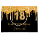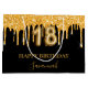 A chic black background. Decorated with faux gold glitter drips, paint dripping look. Personalize and add a name. With the text: Happy Birthday. The name is written with a mode hand lettered style script. Number 18 is written with a balloon style font.