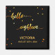 Chic trendy black backdrop and faux gold text written with a trendy hand-lettered style script: hello eighteen. With golden dots as decor. Templates for a name and a date, golden letters. Elegant and modern for a 18th birthday party, can be used as a favour or a save the date reminder for your guests.