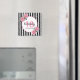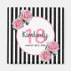 A magnet for a 18th birthday party. Classic slim black and white vertical stripes as background. With girly and feminine pink roses as decoration.