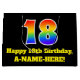 This colourful and fun birthday-themed giftbag design features a large number "18" with a rainbow spectrum gradient inspired pattern, along with the message "Happy 18th Birthday,", and a customizable name. The background is coloured black. A birthday themed gift bag like this might be a fun way to wrap a gift or present being given to somebody who is celebrating their eighteenth birthday. [~Z0000521]